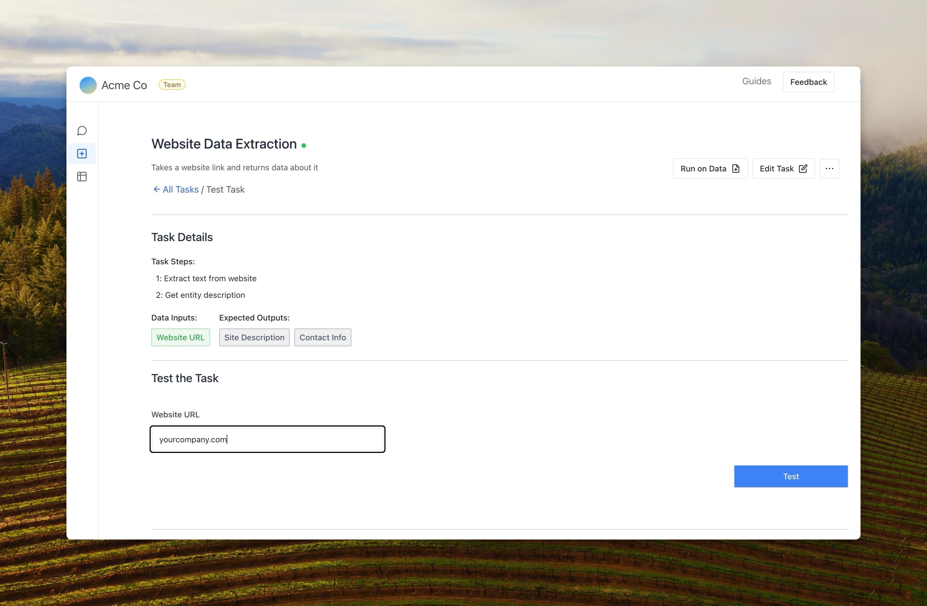 After creating the task, PromptLoop will generate a test page where you can input a sample website URL to see how your scraper performs. In our example, we'll use the website "Boulder CPA Partners." Simply enter the URL, click "Run," and watch as the AI model reads the website and returns the requested information, including the services offered, contact number, and whether tax services are listed.